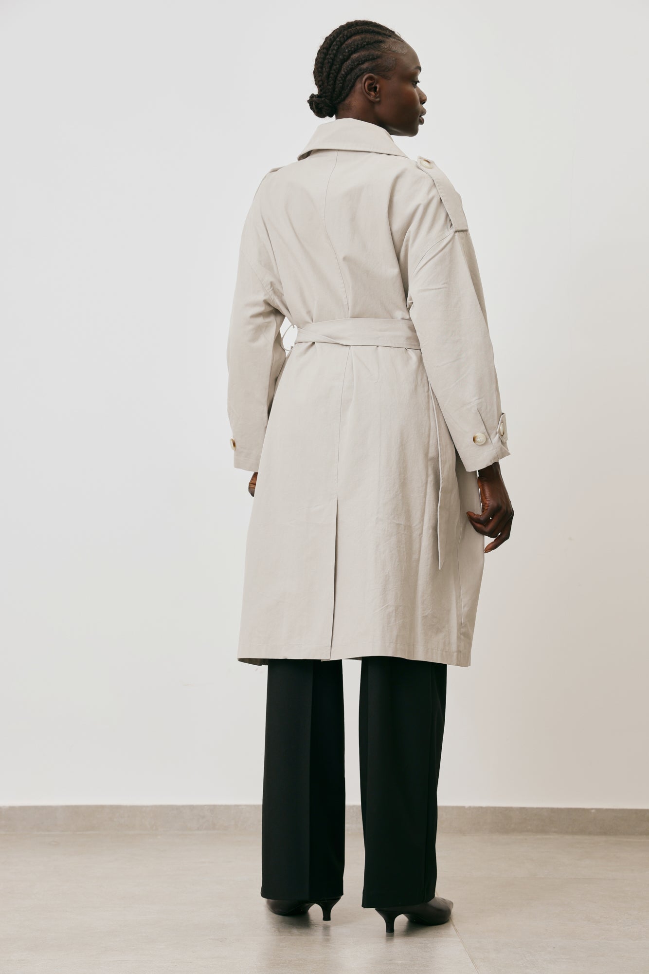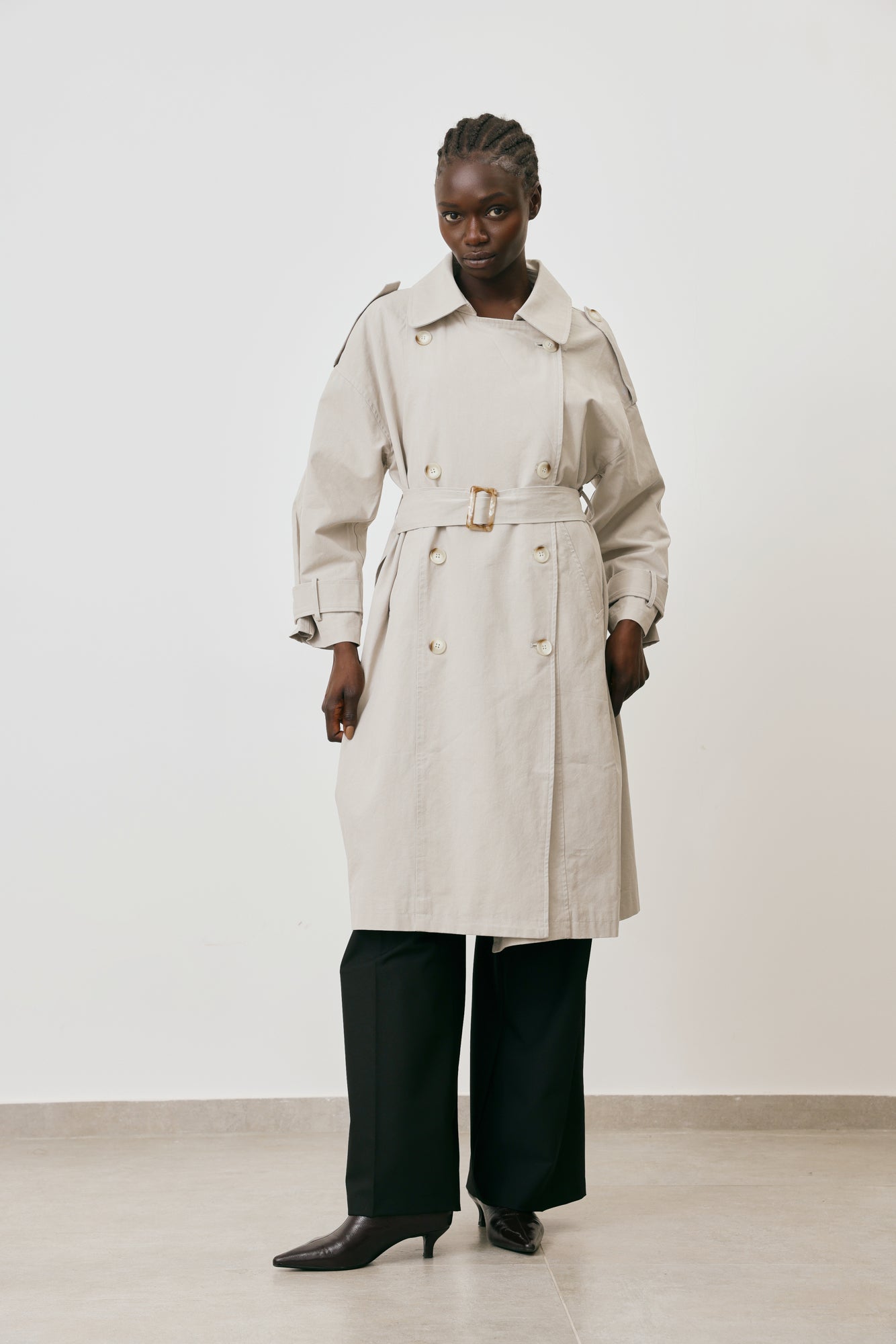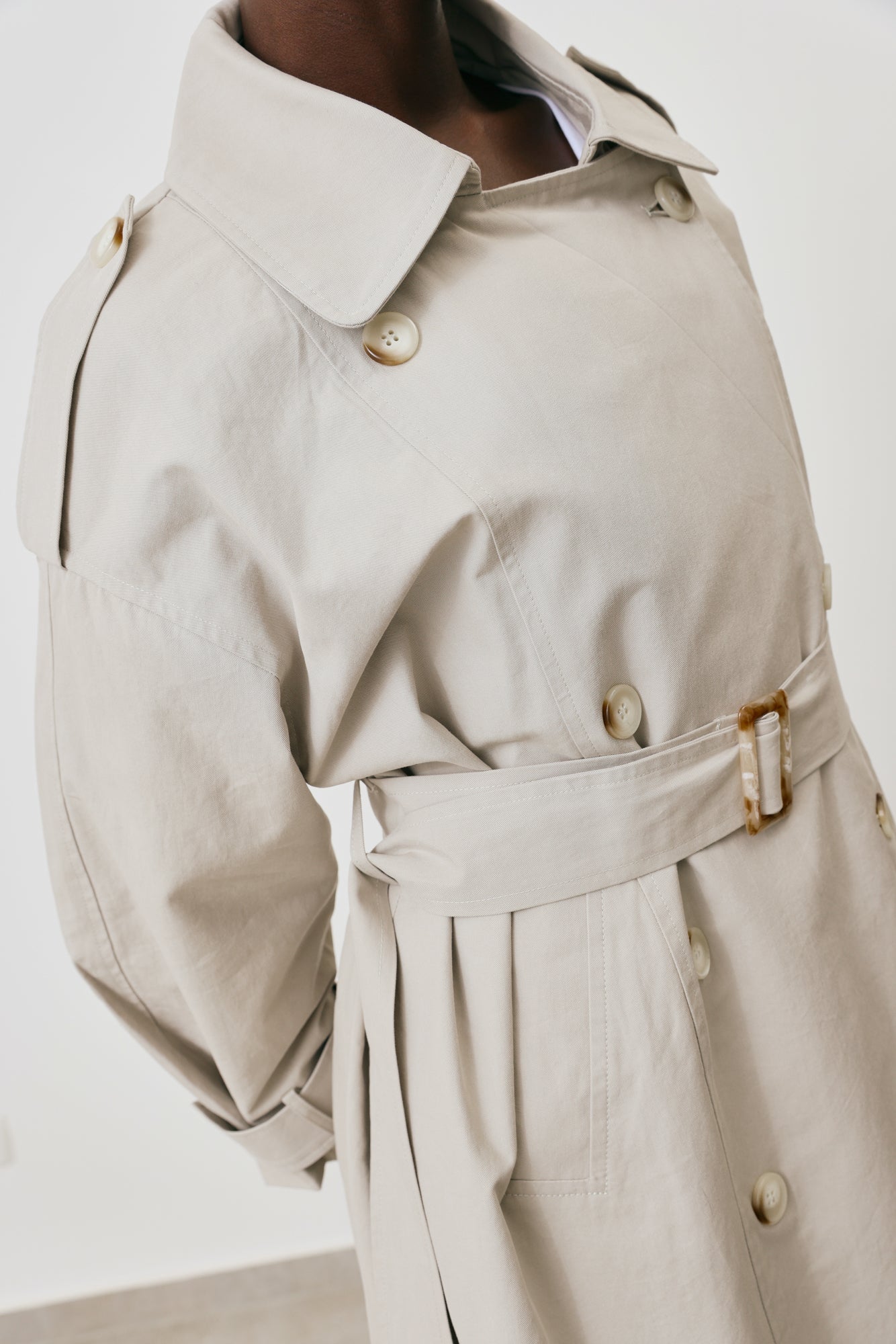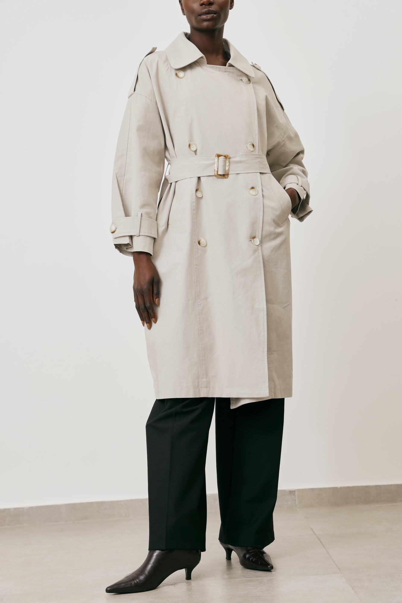 • Double-Breast closure, belted waist, side pockets
